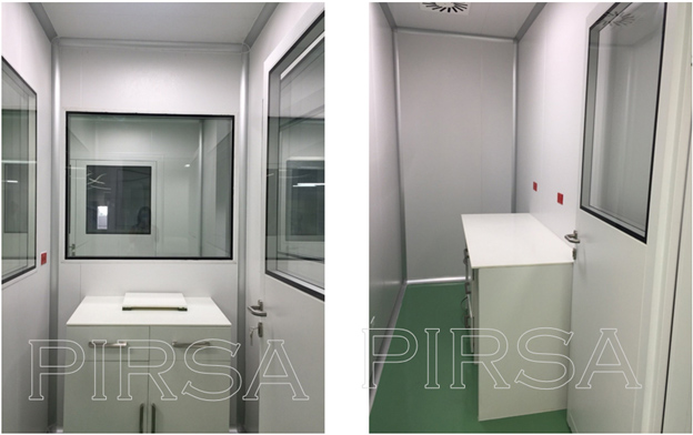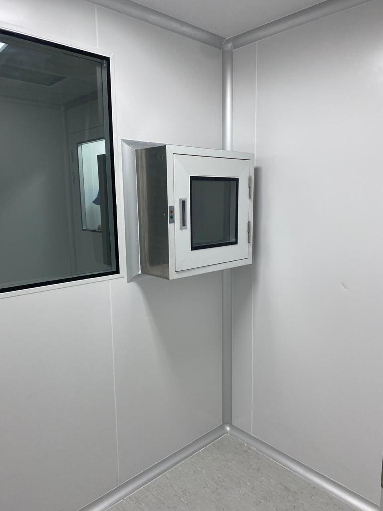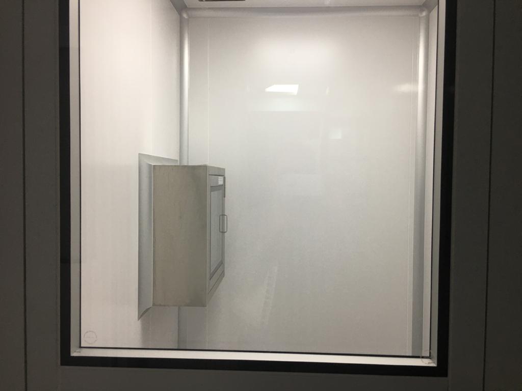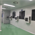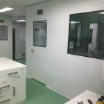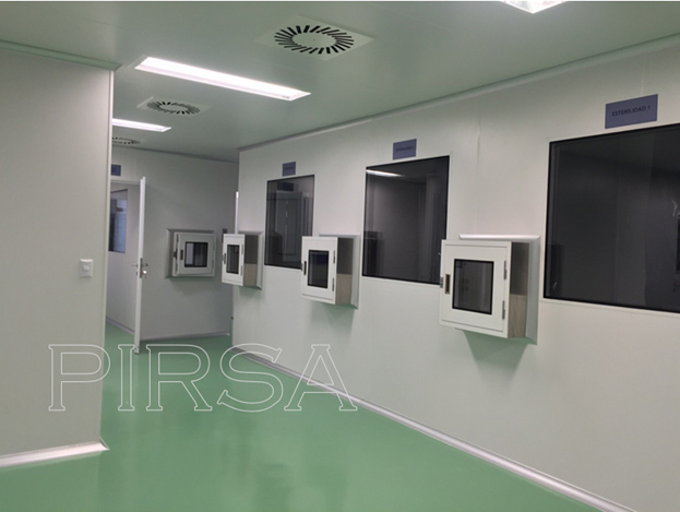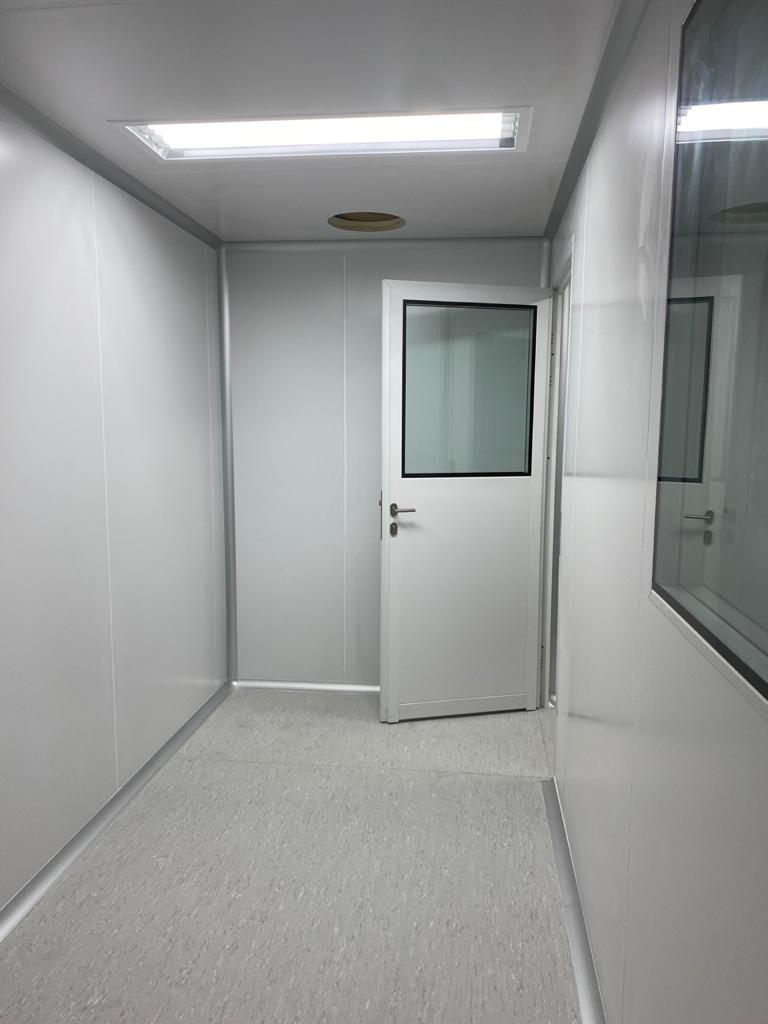Instalación de paredes y cielo con panel sanitario, ventanas y puertas para salas limpias con y sin sistema de autobloqueo, curva sanitaria de aluminio anodizado, luminarias con mantenimiento por arriba, Pass Trough y difusores de inyección y extracción de aire purificado.