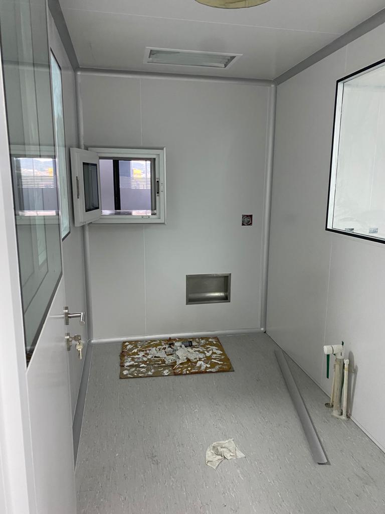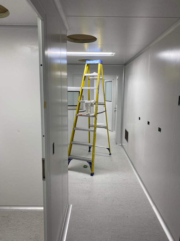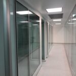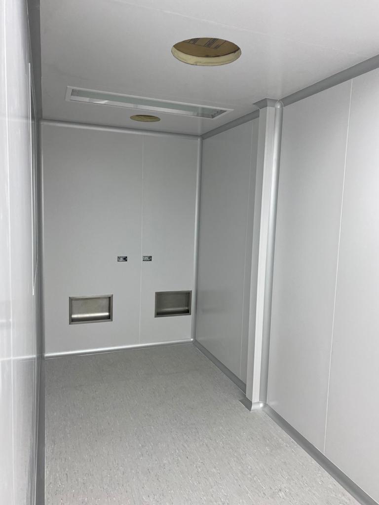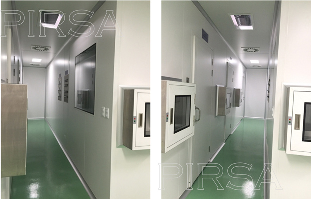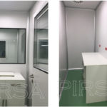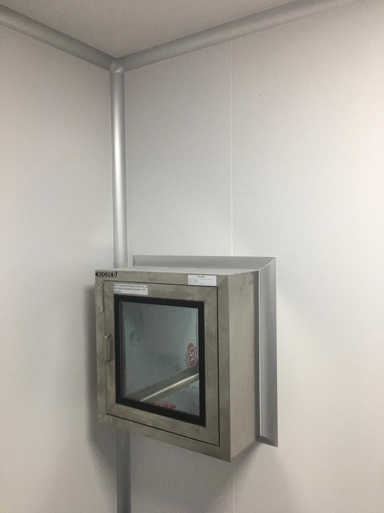 Instalación de paredes y cielo con panel sanitario, ventanas y puertas para salas limpias con y sin sistema de autobloqueo, curva sanitaria de aluminio anodizado, luminarias con mantenimiento por arriba, Pass Trough y difusores de inyección y extracción de aire purificado.