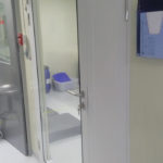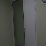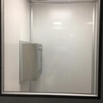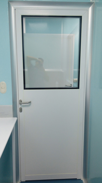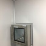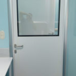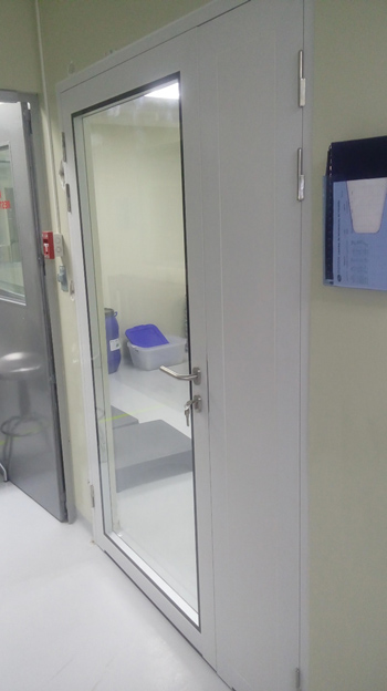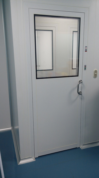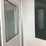 Instalación de puertas para salas limpias de doble hoja asimétrica en área de esclusa de ingreso de materias primas en Central de Pesado y en área de fabricación de formas farmacéuticas sólidas.