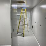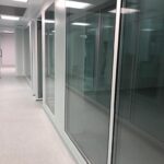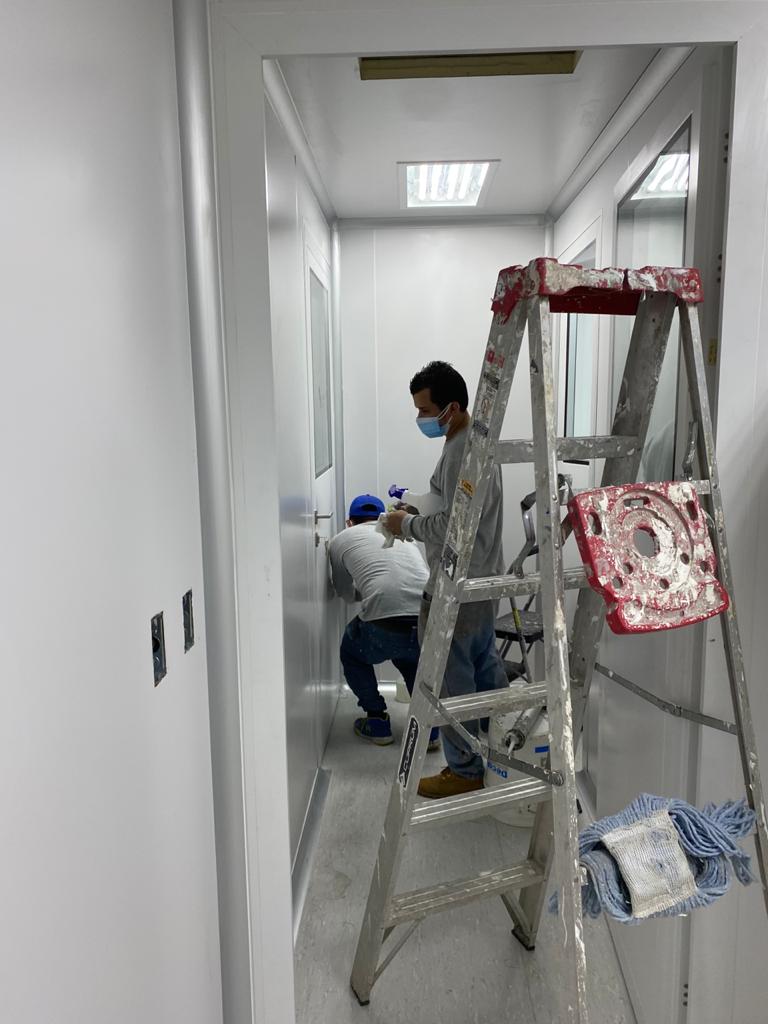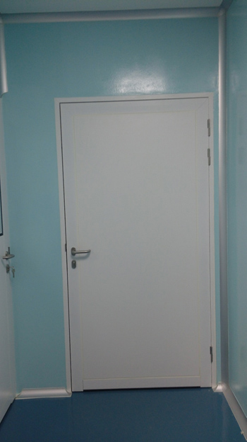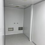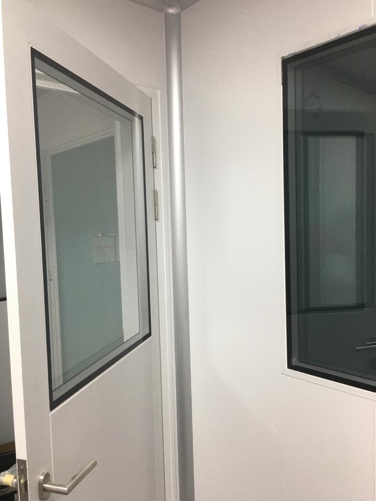 Instalación de paredes y cielo con panel sanitario, ventanas y puertas para salas limpias con y sin sistema de auto bloqueo, curva sanitaria de aluminio anodizado. Además, se instalaron puertas para salas limpias y curva sanitaria en paredes de tabla roca.